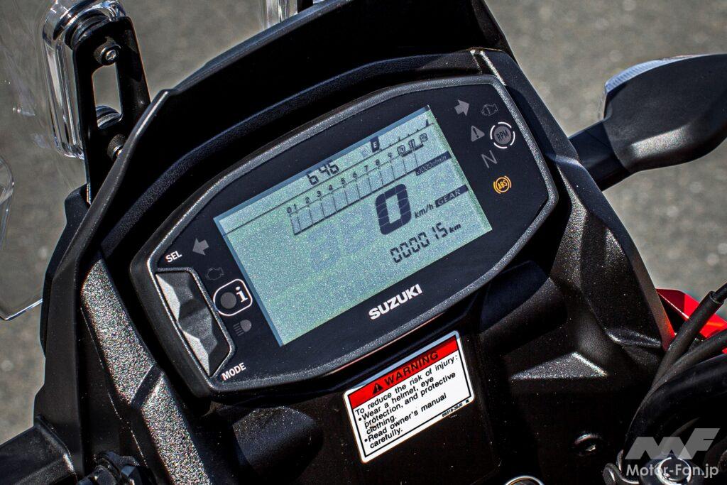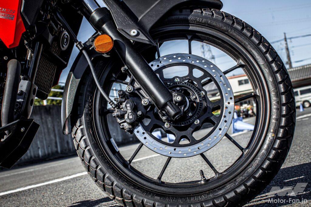 これに対してVストロームSXは、せいぜいメーター読みで70~80km/hまでしか試せなかったが、ベースがジクサーシリーズゆえにコーナーへ進入する際のシャシー剛性感はオンロードモデルそのもの。特にフロントフォークがしっかりしており、あえてジクサーからサスストロークを伸ばさなかったことで、それが顕著になったと言えるだろう。また、リヤショックのバネレートが調整しやすいのも大きな美点だ。