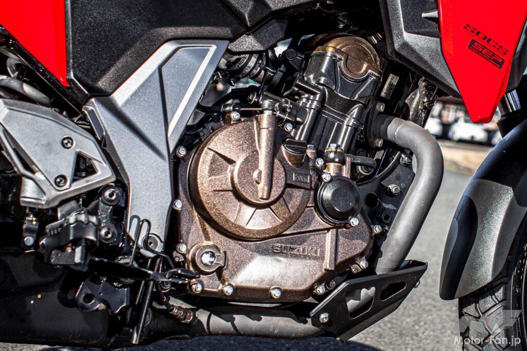 順を追って説明しよう。まずはエンジンから。VストロームSXに搭載されているのはジクサーシリーズと共通の249cc油冷シングルで、インド仕様同士のスペックが同一であることからも、ジクサーからセッティングや仕様などは変えていないと思われる。ちなみに、インド仕様のジクサー250の最高出力は26.5ps/9,300rpm、最大トルクは22.2Nm/7,300rpmで、日本仕様の26ps/9,000rpm、22Nm/7,300rpmをわずかに上回る。