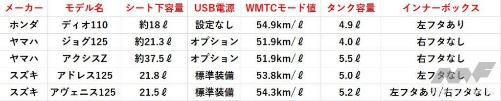 これを執筆している2023年1月現在の、日本メーカーにおける原付二種スクーターの正規ラインナップが上の表だ。車両価格を30万円以下に限定すると、現状5機種しかないことになる。全車が空冷4ストSOHC2バルブ単気筒エンジンで、ディオ110のみ125ccフルサイズではないが、最高出力はほぼ横並びであることが興味深い。また、ホイール径にもコンセプトの違いが表れていると言えるだろう。