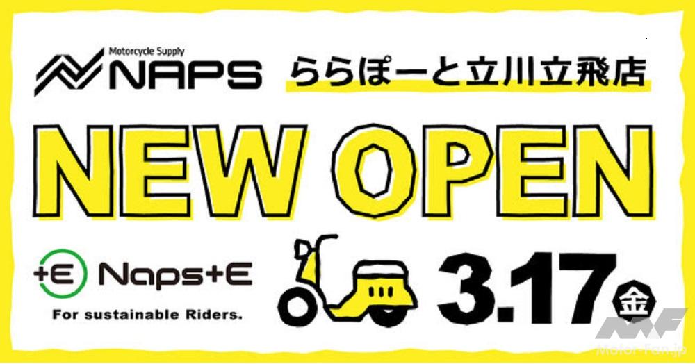 今回の「ナップスららぽーと立川立飛(たちかわたちひ)店」の出店により、ナップス店舗は国内外合わせ合計33拠点になる(2023年2月23日オープンの堺インター店、中古バイク用品買取販売「アップガレージライダース」6店舗含む)。また、総合オートバイ用品店として初の大型商業施設への出店する。