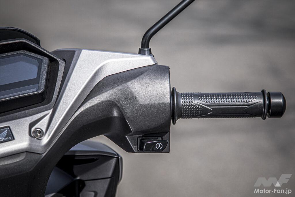 左右の手元のスイッチは至ってシンプル。左側の、下にウインカースイッチ、上にホーンボタンという近年のホンダの構成にはあまり賛同できないが、シンプルなのは歓迎したい。欲を言えばキルスイッチがあると自主的なアイドリングストップができたのに、とは思った。
