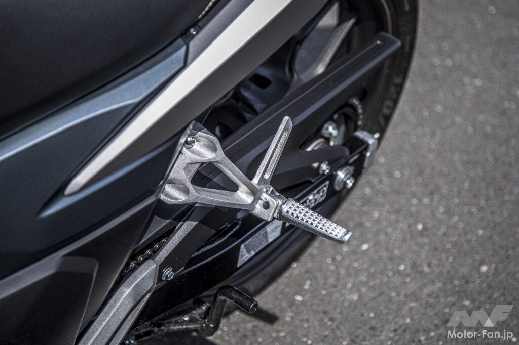 フロントフォークのしなやかな構成により、逆にリア周りはしっかりと作ってある印象。スイングアームもしっかりしているし、リアサスもクラスを越えた、ちゃんとスポーツバイク然としたものが装着されている。作動性も極めて良好だ。