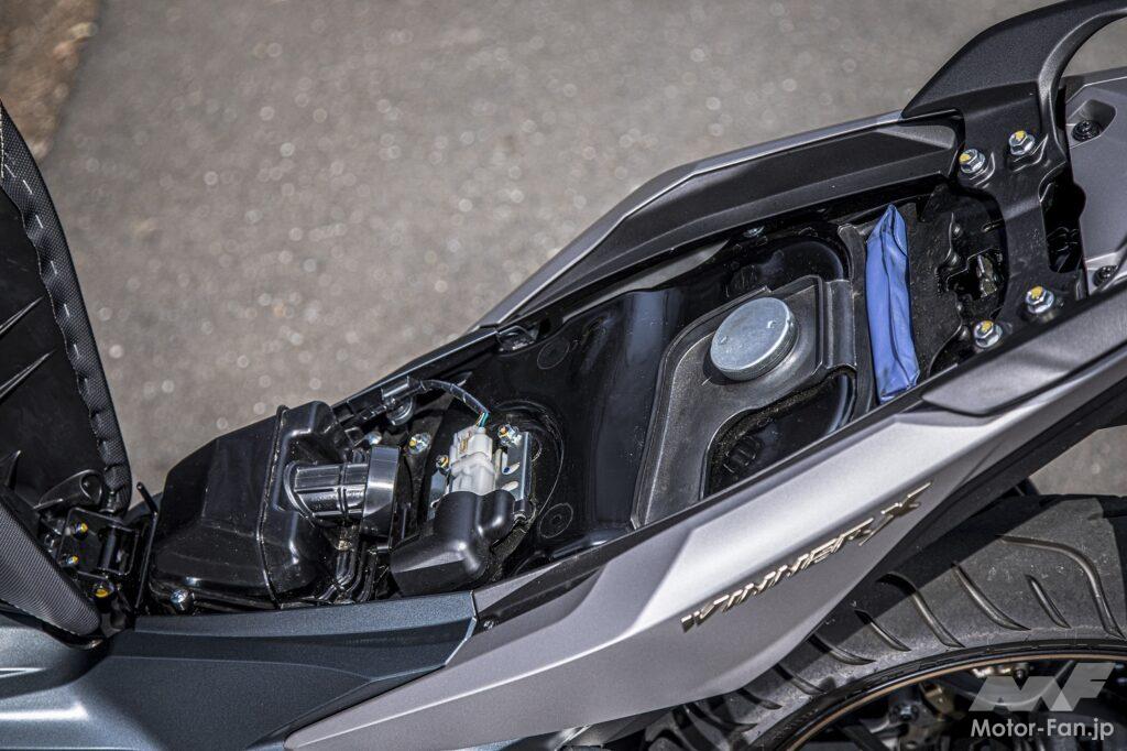 硬めのシートはスポーツ心をくすぐるが、クルージング時に深く腰掛ければ尻を包み込んでくれる快適さもあった。またタンデム部との境目には白いステッチが入るなど高級感も高い。タンデム部の面積は大きくはないものの、タンデムグリップはしっかりしていて取り回しにも重宝する。シート下にはカブ系よろしく燃料タンクを配置。容量は4.5Lと少なめにも思えるが、リッター40kmを超えることを思えば150~200kmの航続距離を期待できそうだ。なおヒンジ横にはヘルメット用のフックが2つ備わっているためタンデムライドでもヘルメットの置き場所は安心。