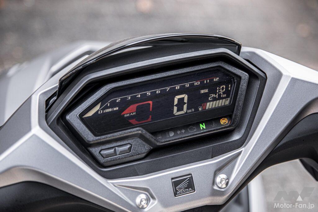 反転液晶で、シンプルで見やすいメーター。わかっているのに、車体の構成的に「なんでスクーターなのにギアポジがあるの?」という違和感がぬぐえない。6速ミッションを備えるのだからギアポジインジケーターがあるのは自然だ。常時表示の時計があり実用性も確保しつつ、一目でわかるタコメーターなどスポーツ心にもしっかり対応。短いスクリーンやホンダのエンブレムなど高級感も高い。
