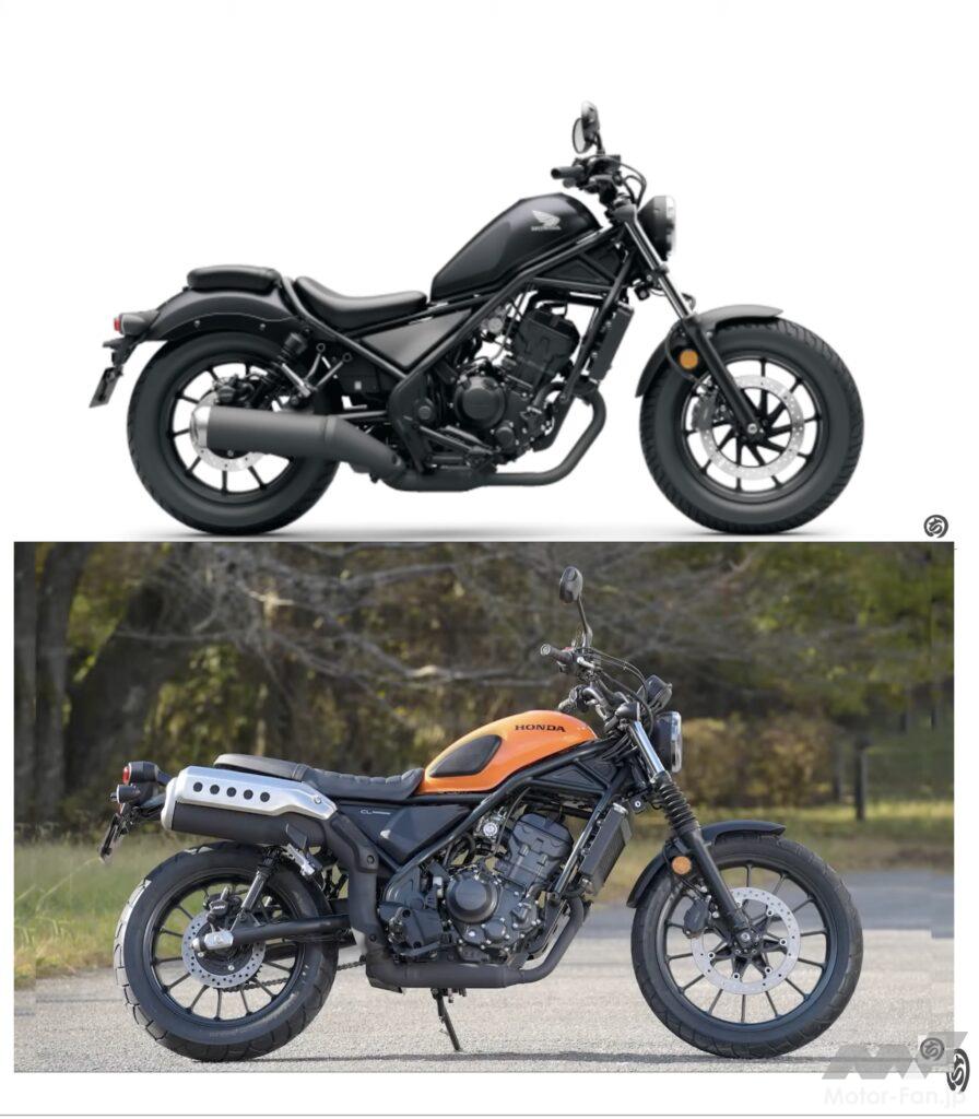 以前のモデルもロード向けだったCBなどをベースにスクランブラーであるCLとしていた。だから今回発売された新型CL250も過去と同じことをしたと受け取れる。過去と違うのはCBをベースにしたのではなく、アメリカンの人気モデルであるレブル250をベースにしたこと。それは両車を見比べれば誰でも気がつくことで、メインフレームやエンジンなどは基本的に同じ。大きく異なるのはメインフレームから伸びるシートフレームの位置と形状で、シート高を上げつつ最低地上高もレブルの134mmから165mmへと高くされている。