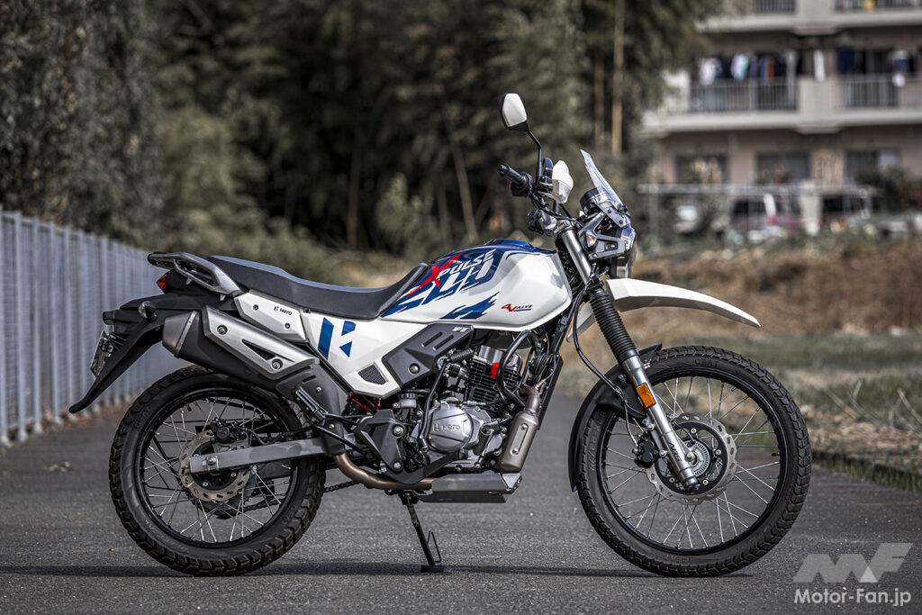 そんなHEROのX-PULSE 4Vはオフロードテイストの車体を持つ200ccモデル。いわゆる「オフ車」的な成り立ちではなく、TLM220や少し前のBMWを思わせるようなちょっと長めのタンクや、小さいウインドシールドを備えるフロント周り、そして長距離やタンデムも想定したようなワイドなシートなどを備える構成だ。