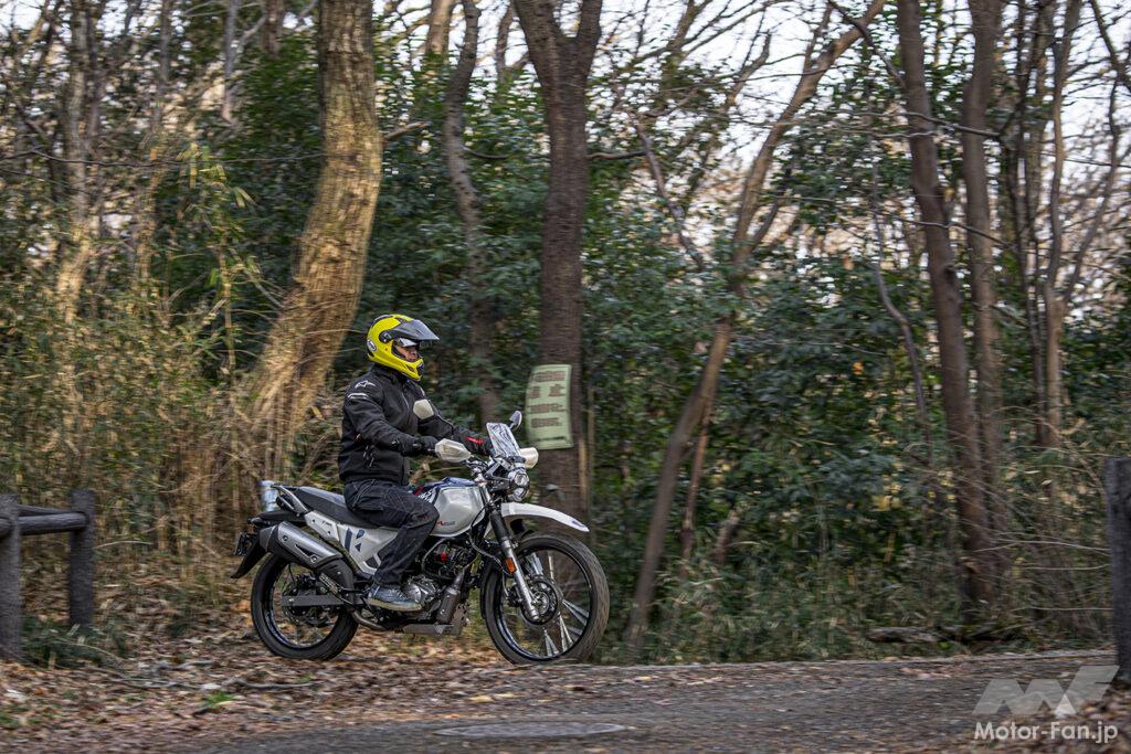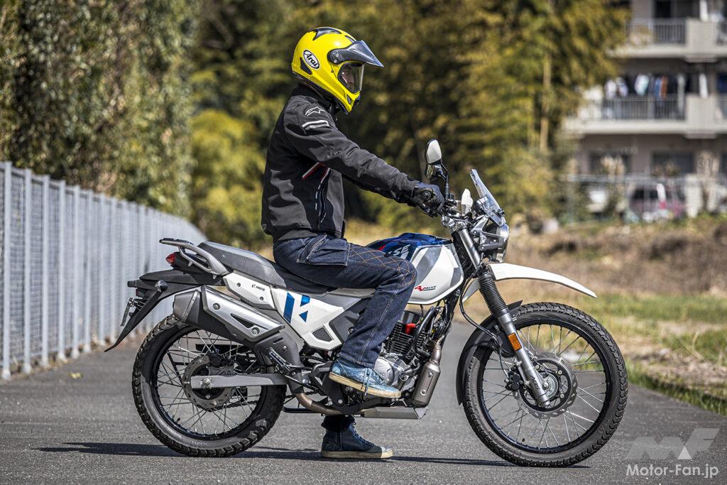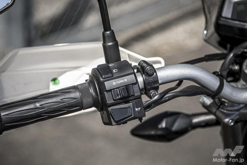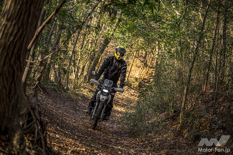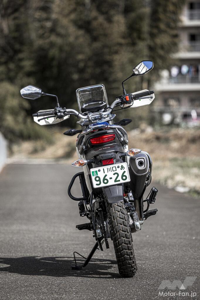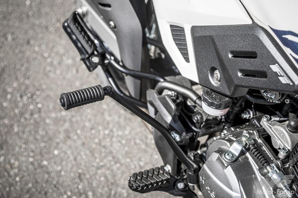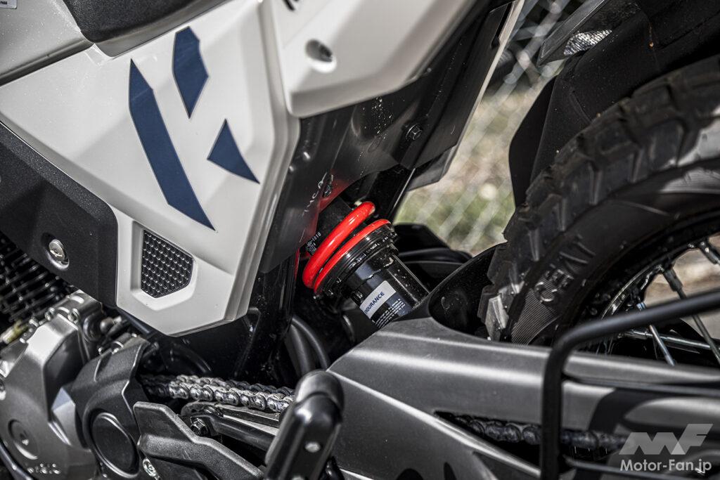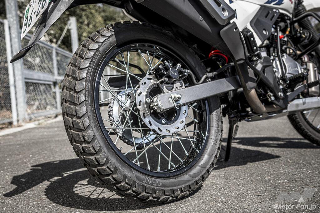 フロント21インチホイールで本格的なオフ車テイスト。よく効くディスクブレーキにはABSもついて安心だ。タイヤはブロック形状とはいえロード向けのため、不整地を重視するなら交換しても良いだろう。フォークにはフォークブーツが装着され、フェンダーはアップタイプと、フォーク後方にはエンジン部への泥ハネを抑制してくれるダウンタイプも装着。ヤマハ・セローと同じ構成だ。