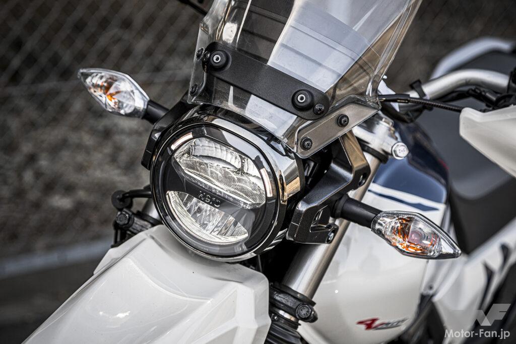 小さなスクリーンを備えるあたり、かつてのTT250R Raid の姿も連想した。ハンドルガードも標準装備。やはり本気のオフ車というよりもアドベンチャー的位置づけなのだ。ヘッドライトはカブなどについているのと似たイメージの丸型LED。