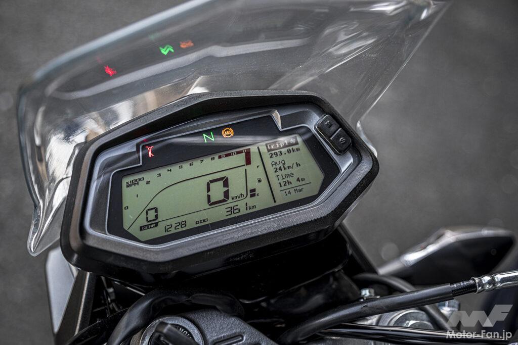 ここでもどこかホンダを連想させる成り立ちとなっているメーター。ギアポジションや平均速度など充実の表示内容に加え、ブルートゥース接続も可能という。