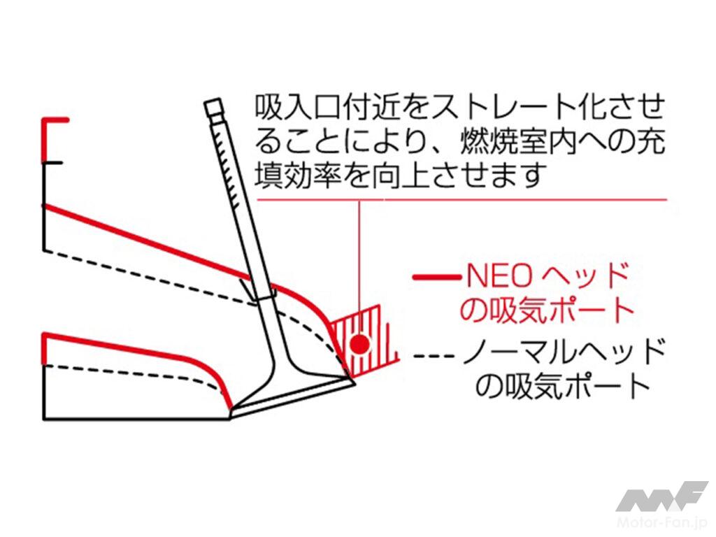 バルブフェイス径を吸気バルブΦ25.5→Φ30、排気バルブΦ21→Φ24.5に拡大した「NEO シリンダーヘッド」