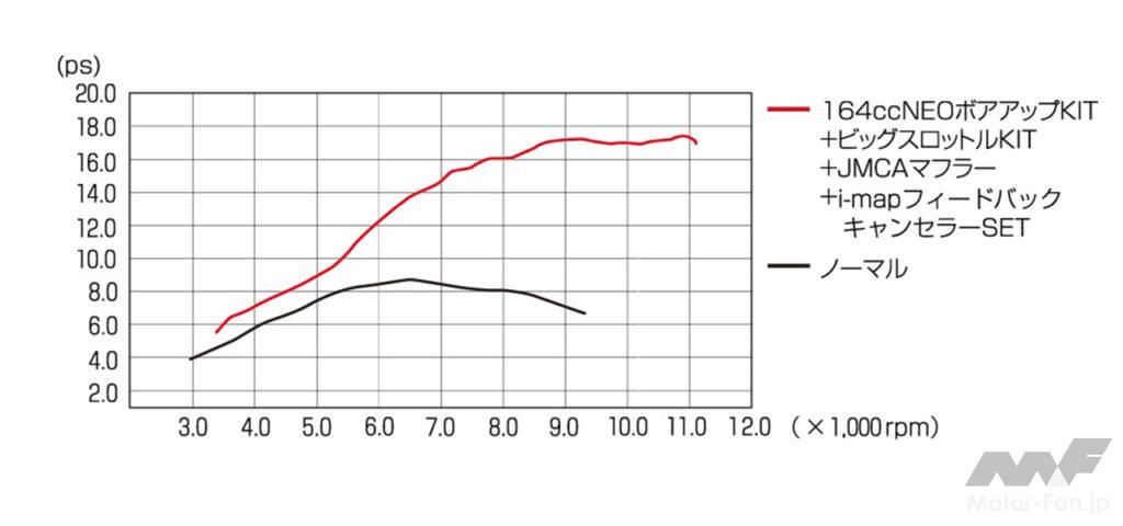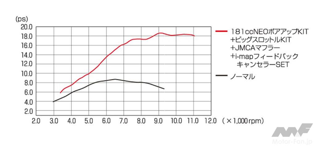 NEOボアアップKITの排気量は、164cc(ボア径Φ60mm×ストローク長57.9mm)と181cc(ボア径Φ63mm×ストローク長57.9mm)の2種類に設定。どちらの排気量もボア径よりストローク長の短い、レーシーなショートストローク型に設定。一般的にショートストローク型エンジンは、エンジンの回転を上げてパワーを稼ぐ、レース用マシンやスポーツモデルに多用されるタイプ。後輪出力による164ccと181ccのパワーグラフの違いは、下記を要チェック。