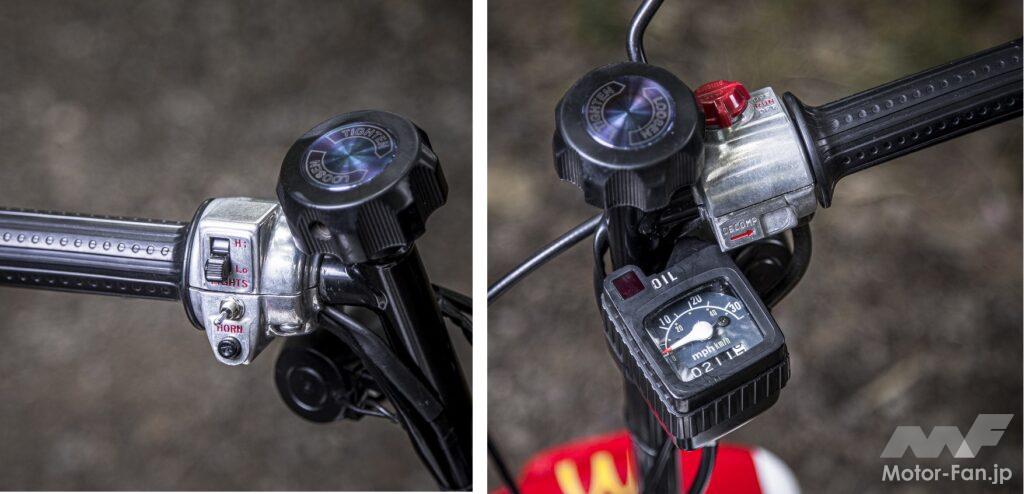 スイッチ周りはアメリカの原付バイクから移植。ダイヤル式のキルスイッチ(右)やウインカー用に追加したトグルスイッチ(左)がオシャレ!