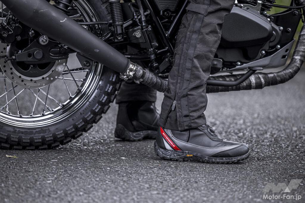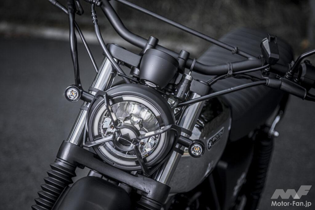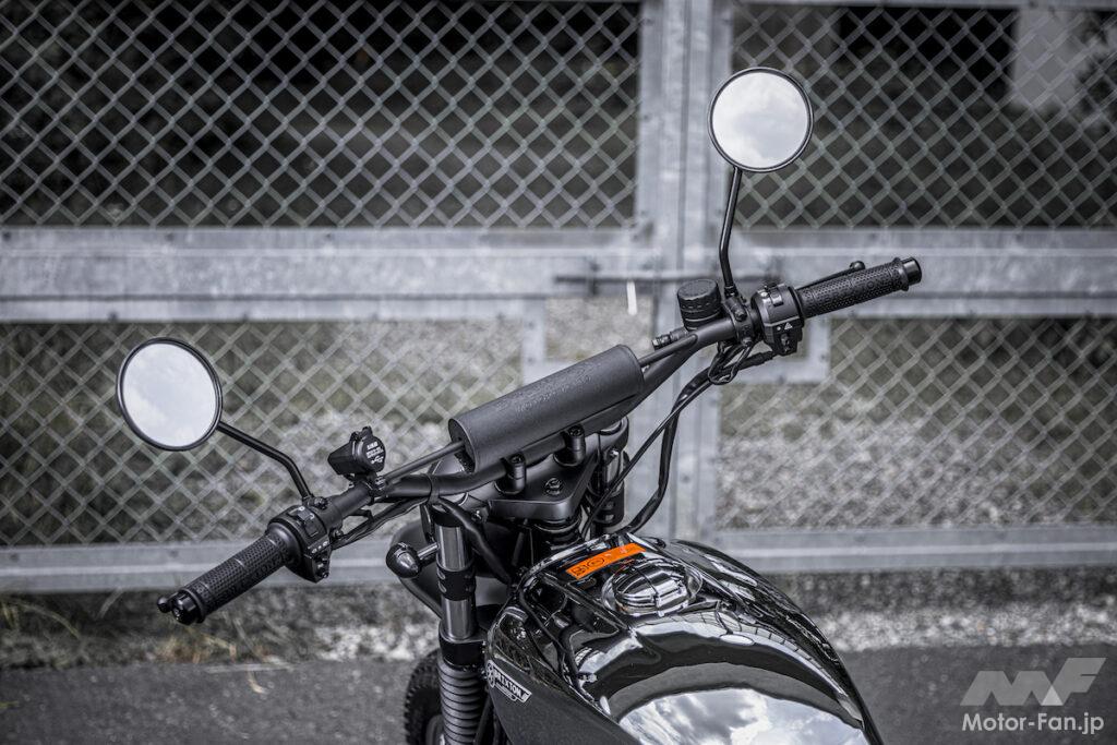 ボディ各所のデザインもビンテージマシンの流儀をていねいに踏んでいる。まずショートなアップフェンダーの直下にはトライアル風のノビータイヤが収まっており、マフラーのエンド部分は後方に向かって跳ね上げられ、さらにブリッジがかけられたハンドルバーもエキパイに巻かれたバンテージも、みなクラシカルな趣きだ。