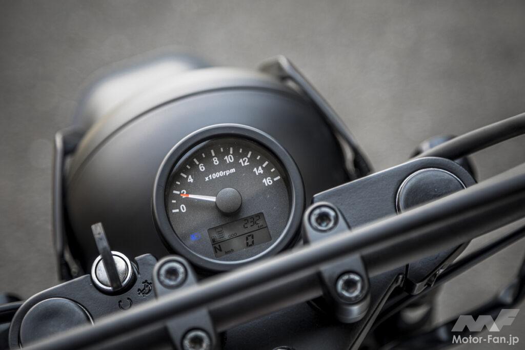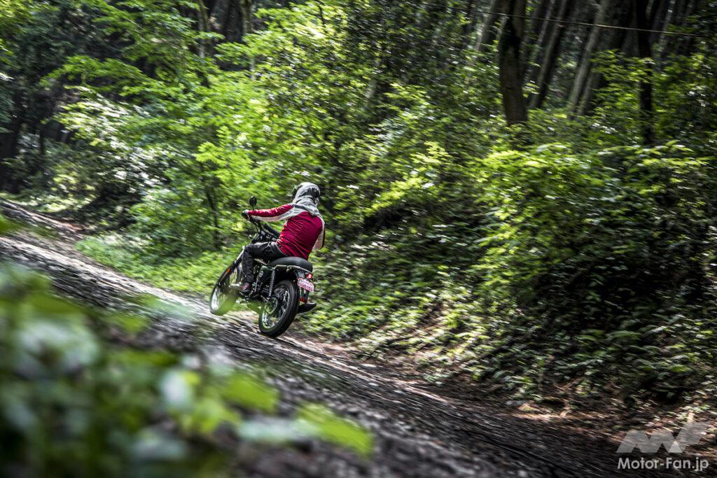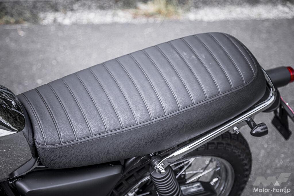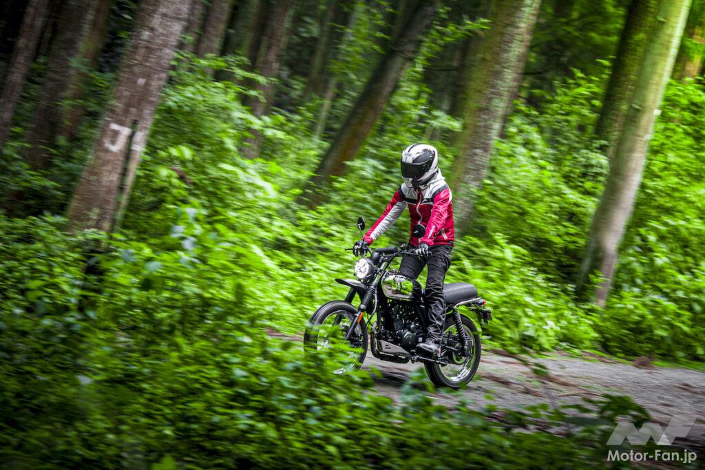 深く刻まれた空冷フィンの単気筒エンジンは信頼度の高いスズキ製だ。始動はインジェクションゆえあっけなく、スロットル操作にリズミカルに呼応するサウンドは穏やかで心地いい。クラッチをつないでいざ走り出せば“11ps”なりに加速する。排気量が倍の250ccあればもっとトルクフルにスピードを乗せていくだろうし、楽もできるだろう。しかし「そこまで急ぐわけでもないし」とノンビリを決め込めば不足を感じるほどではなく、むしろこのくらいのパワー感が車体のオーソドックスな雰囲気に似合っていると思った。