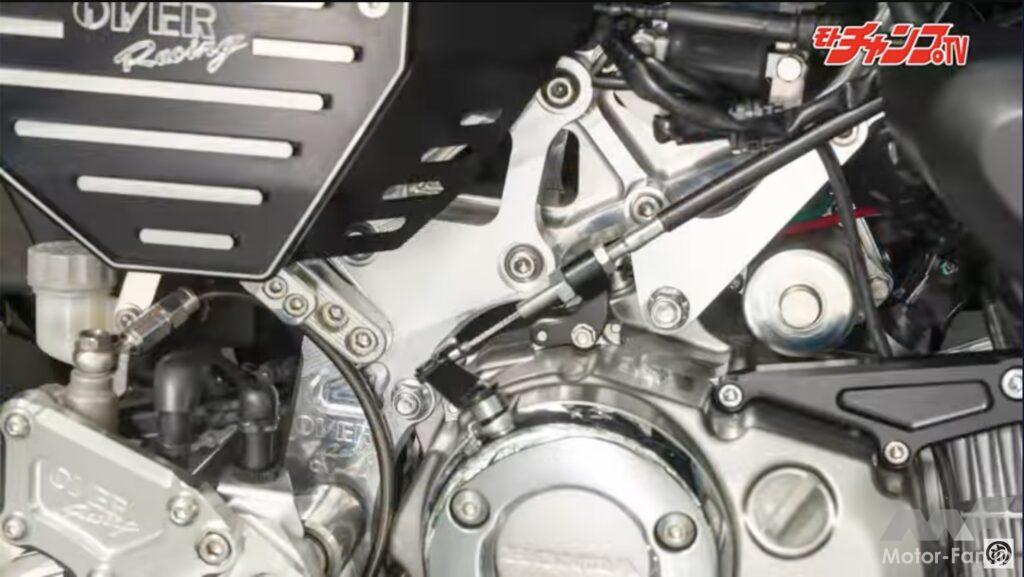 続いてはダックス125。こちらは発売されて間もないため、まだまだ開発中の新製品が控えている状況。未発売の製品も含まれているが、OVERによるコンプリート車両が用意されているので見てみよう。まずムキムキマッチョに見えるポイントがアルミダウンチューブ。ダックス125はプレスバックボーンフレームが特徴で、純正だとダウンチューブは存在しない。ところがアルミの輝きを追加したことで大いに逞しいルックスへと変身している。ネック周辺の強度があまり高くないダックス125なので、アルミダウンチューブはエンジン側に強度を持たせていることが特徴だ。