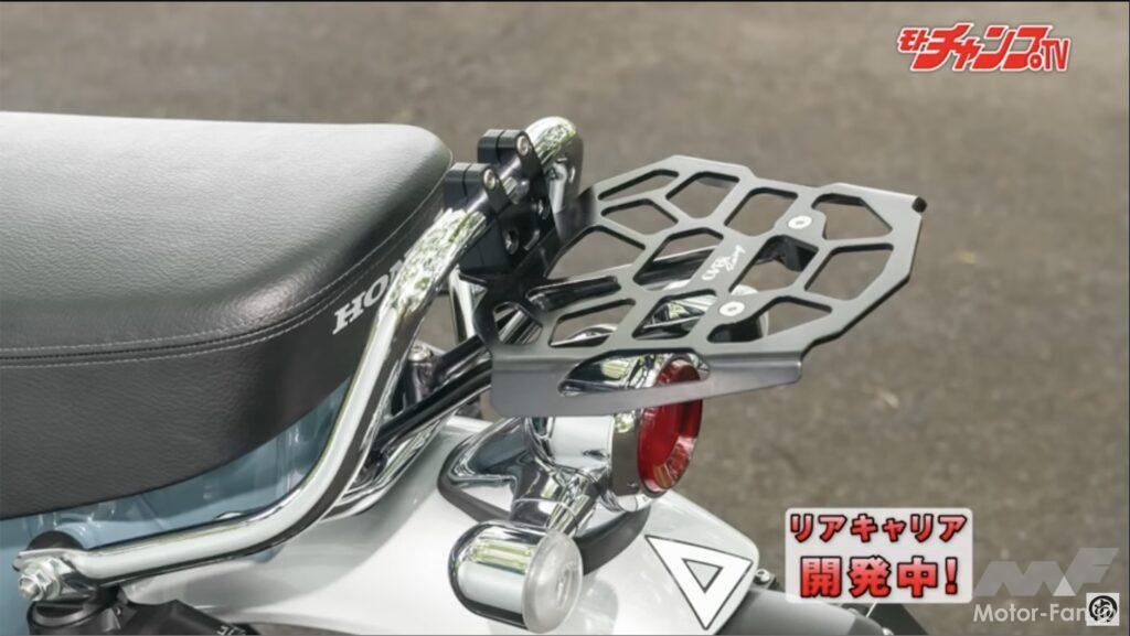 タンデムシート仕様になるダックス125は純正のままだと積載性がイマイチ。そこで注目したいのがフレームへ被せるようにして装着するフレームキャリアと、リヤのタンデムバーに装着するリアキャリアだ。OVERらしくライダーが乗車時、体に当たらない形状としたフレームキャリアは大きすぎず小さすぎず、程よいサイズなのがうれしい。フックがかけやすいデザインなので、ルックスだけでなく使い勝手も良好だ。またリアキャリアは現在開発中とのことで発売が待ち遠しい。こちらは小振りなデザインながら体重をかけても変形したりしないだけの強度を確保している。大きめのボックスを固定するにも不安はないだろう。