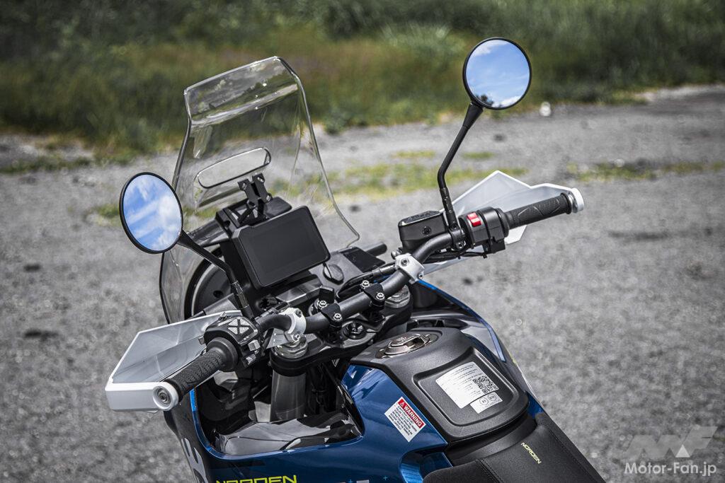 2023年から発売が始まるエクスペディションは、ノーデン901の悪路走破性と快適性に磨きをかけた上級仕様である。最大の注目要素は、構造を一新すると同時にストロークを延長した前後サスペンションだが、ツーリングを快適にする大型スクリーンやヒーテッドグリップ/ライダーズシート、容量36ℓのサイドバッグ&ステー、転倒時のダメージを防ぐスキッドプレート、メンテナンス時に重宝するセンタースタンドなども、スタンダードとは異なる装備だ。