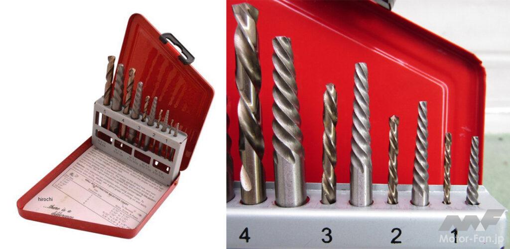 折れたボルトの中心にドリルで穴を開け、そこにテーパー形状&らせん状になったエキストラクターという工具を挿入。挿入したエキストラクターを緩む方向に回していくと、エキストラクターが折れたボルトに食い込み、ボルトが緩んでいくというしくみ。