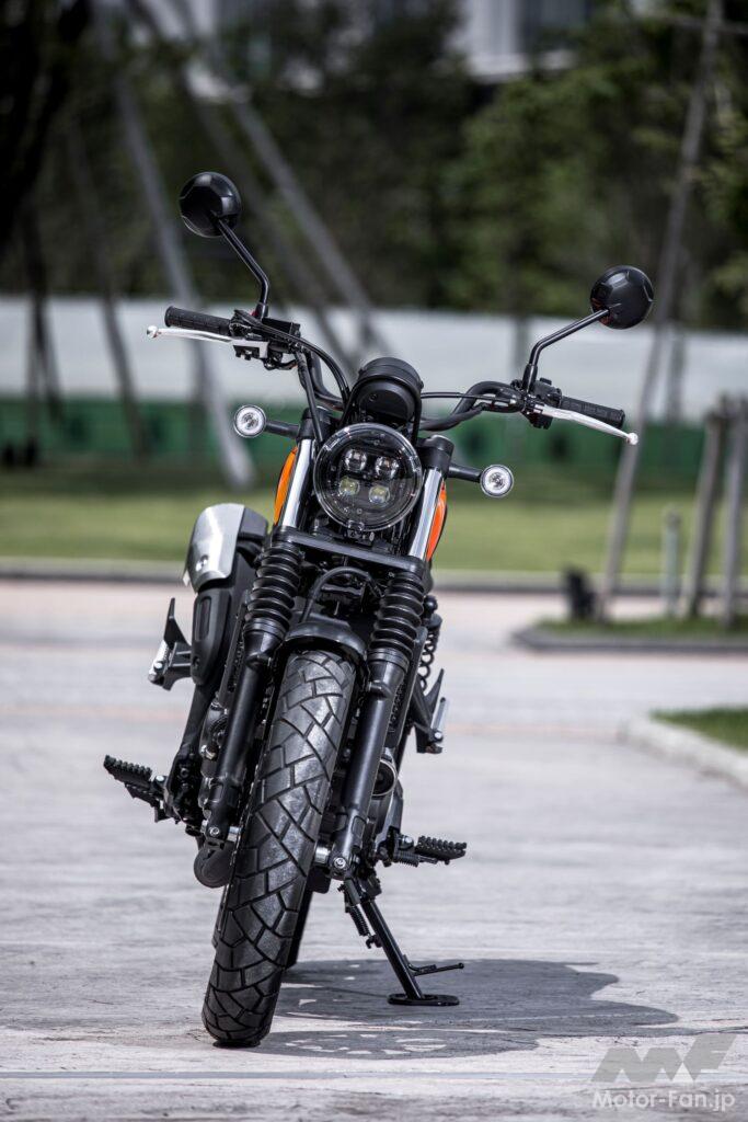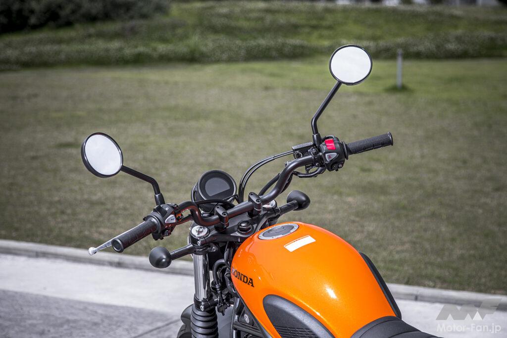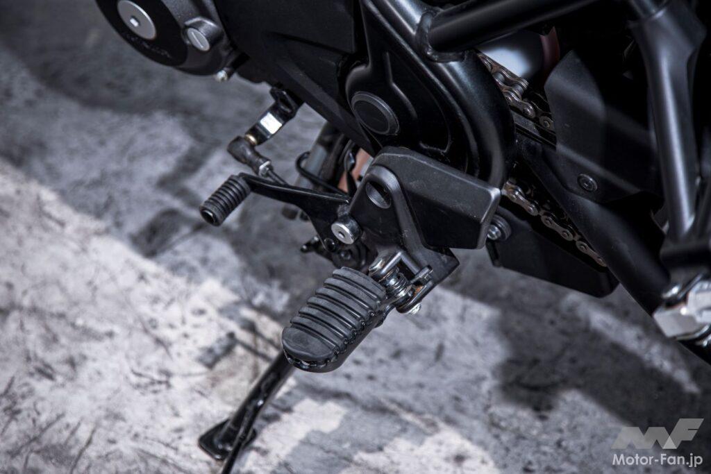 とはいえ、その印象は兄弟車と大きくは変わらない。アイドリング領域のすぐ上、クラッチミートする時に使う回転数ではクランクが重くなっているかのような確かなトルクがあり、ラフにクラッチを繋いでもエンストはしにくい設定。そしてそのちょっと先、ストリートで多用するようないわゆる「常用域」はむしろトルクが薄く感じ、おかげでラフなアクセルワークでもギクシャクせず、かつ燃費も良い。排気音もパタパタと楽しいもので、ストレスフリーのクルージングが楽しめる。