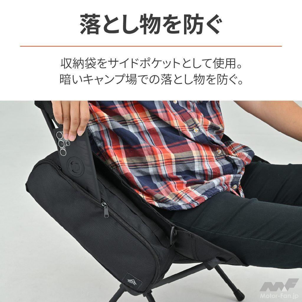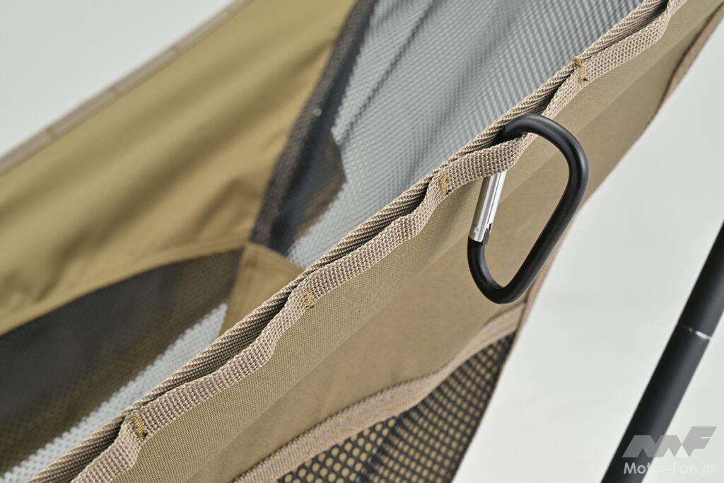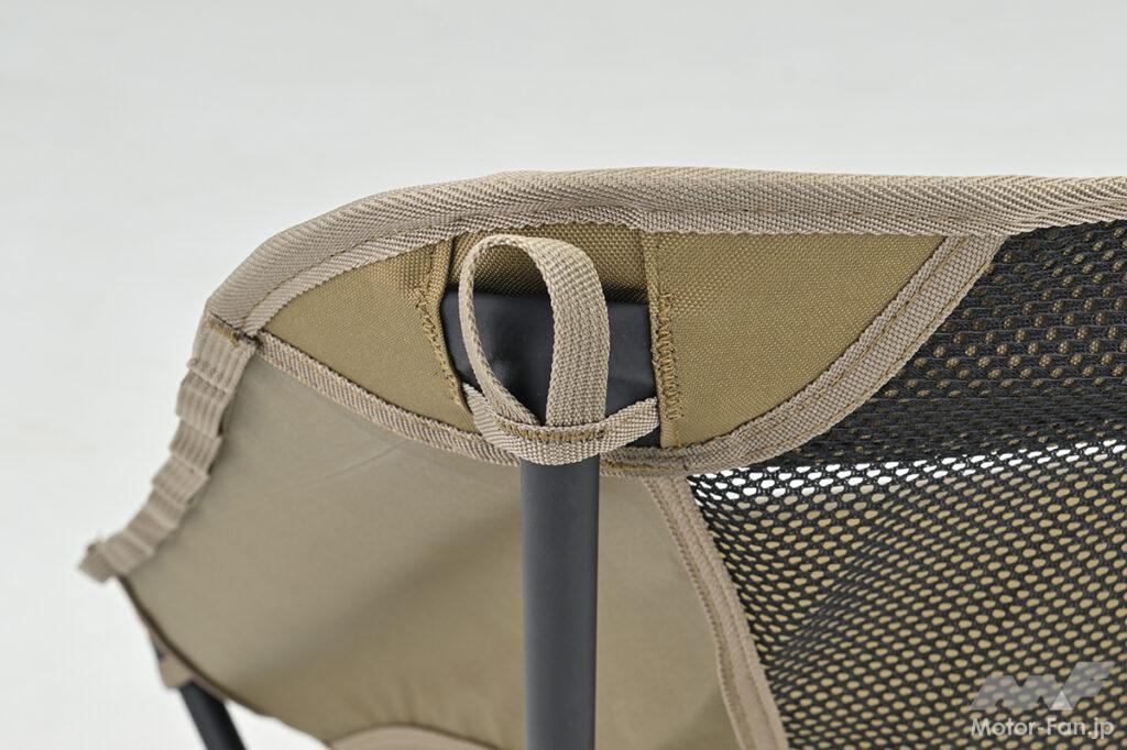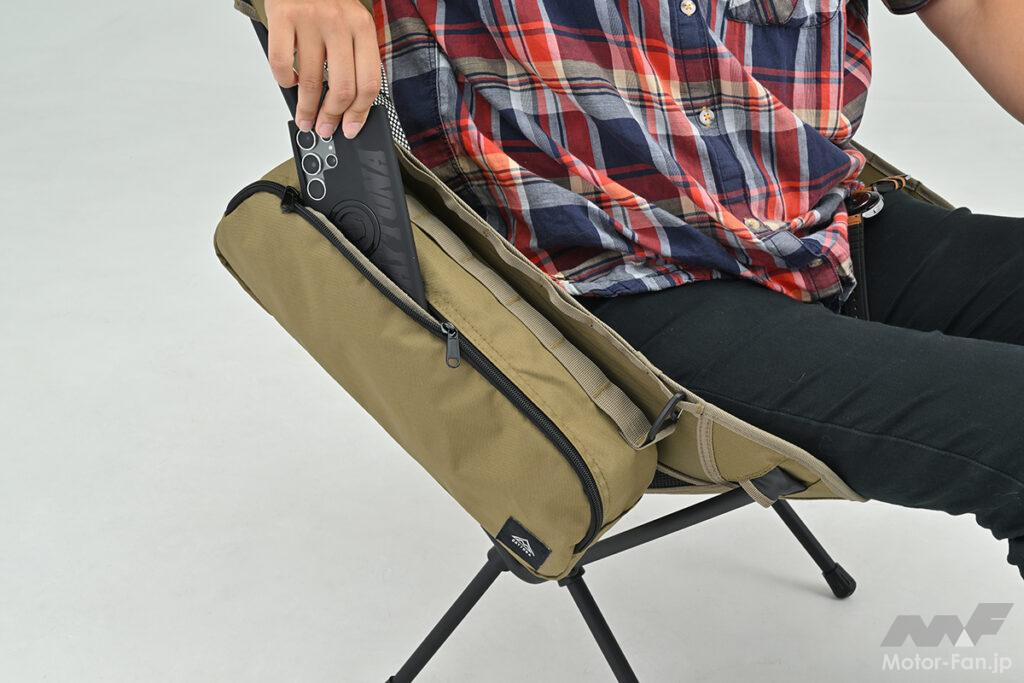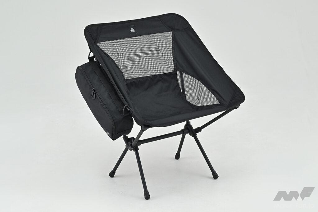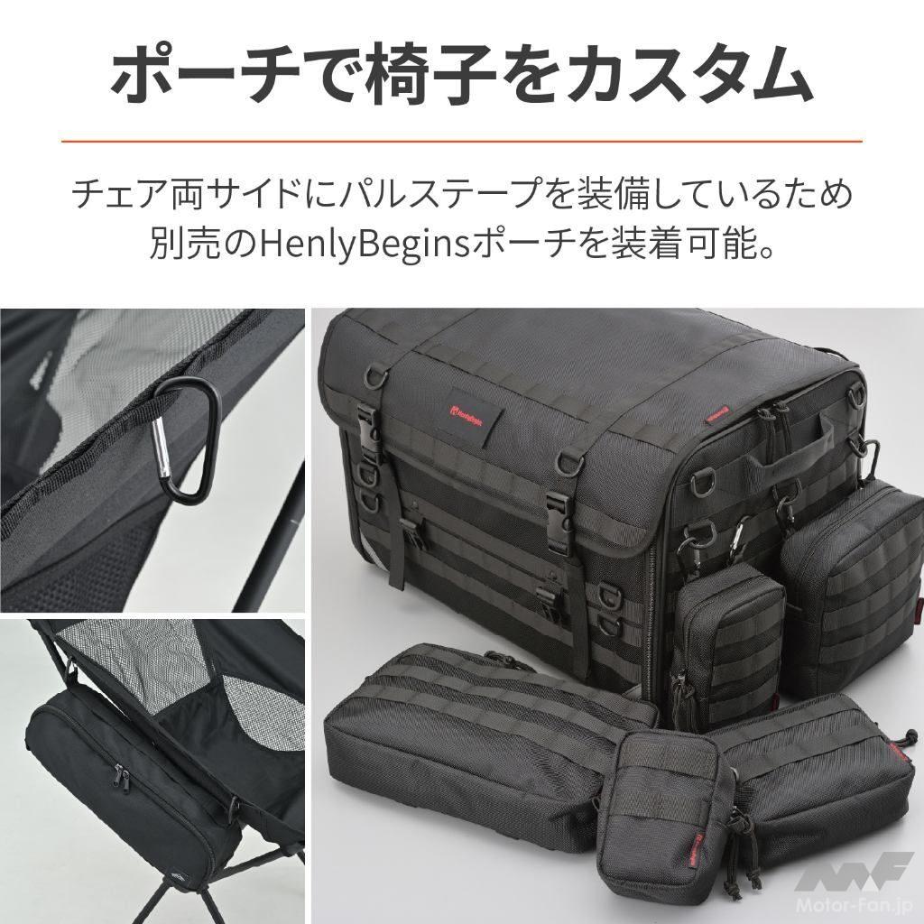写真は軽量コンパクトながら、快適な座り心地を確保したコンパクトアウトドアチェア。両サイドにはパルステープが装備されており、収納袋を小物入れとして利用可能。「ヘンリービギンズ」のシステムポーチの取り付けもOKだ。