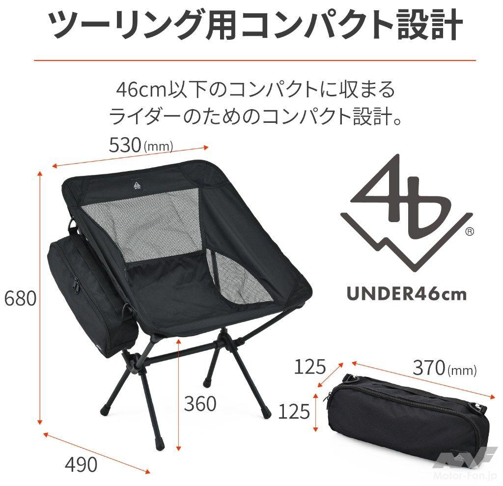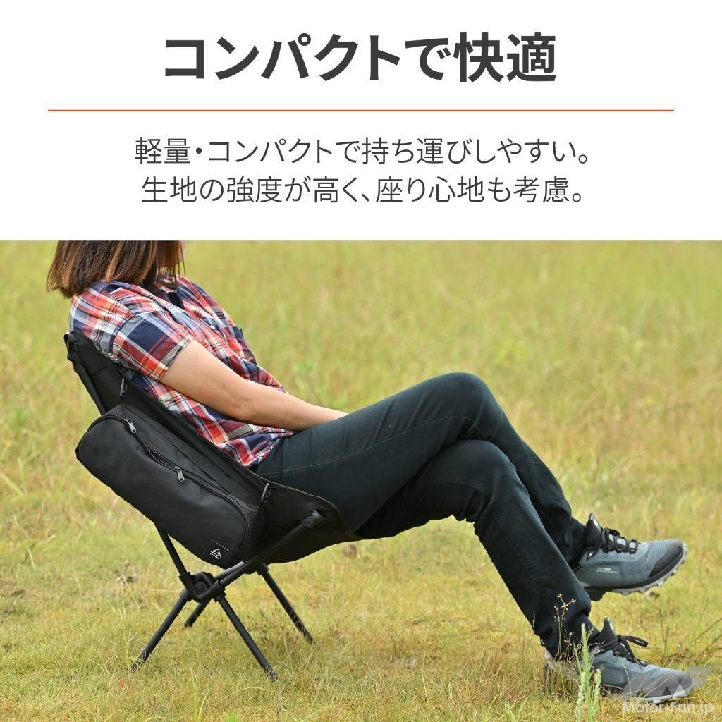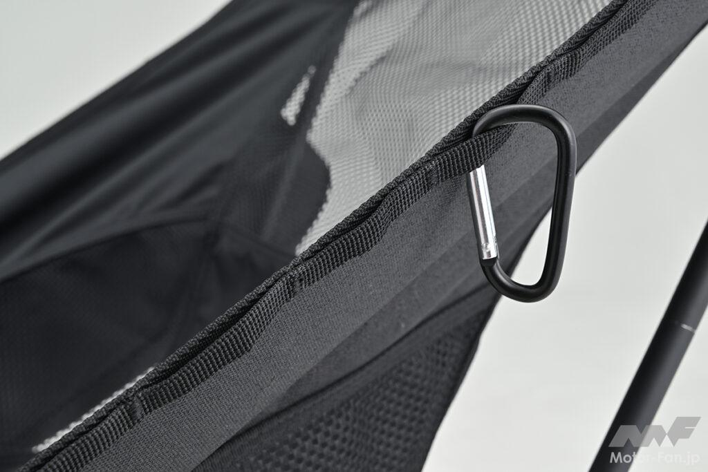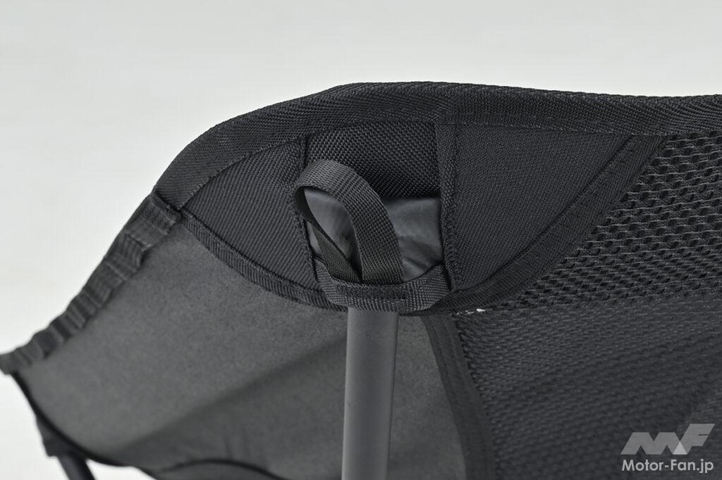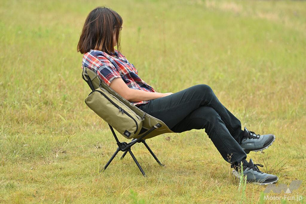 コンパクトアウトドアチェアMILには引っ張りループが装備されており、組み立ても簡単。バイクキャンプを想定した設計により、軽量コンパクトに収納可能。GIVIのサイドケースに収納することもできる。シートバックやザックの底辺にも積載OKだ。