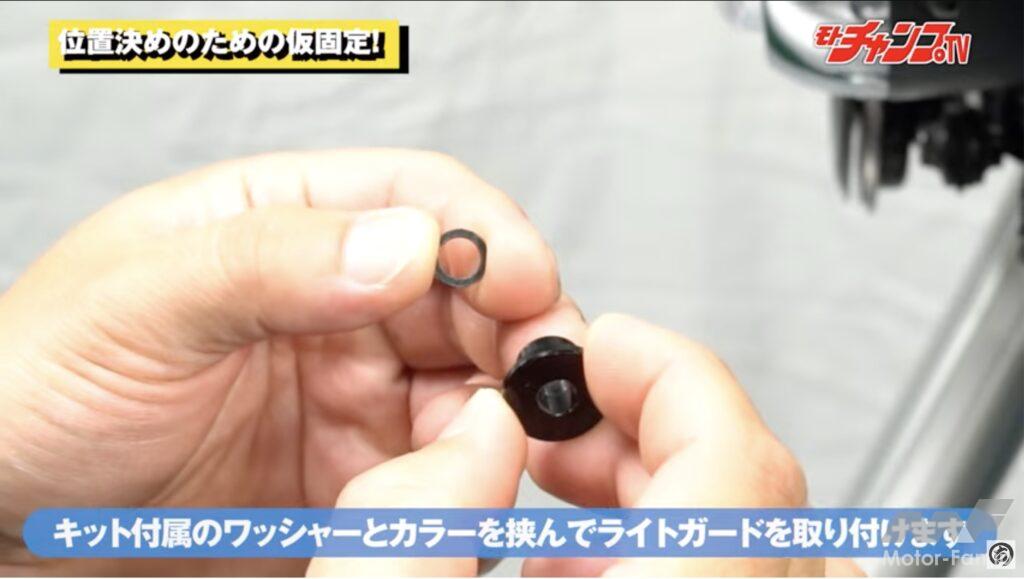 ヘッドライトの下には光軸調整用のボルトがある。このボルトとワッシャーを抜いてヘッドライトガードを下でも固定する。純正のボルトとワッシャーは独特な形状をしているので、無くさないように保管しておこう。ヘッドライトガードの下側ステーとヘッドライト本体の間にキット付属のカラーを挟み込むが、カラーには段がついているので光軸調整ボルト用の穴へ差し込むようにしてからガード側のステーで挟む。続いてキット付属のボルト&ワッシャーで仮留めする。