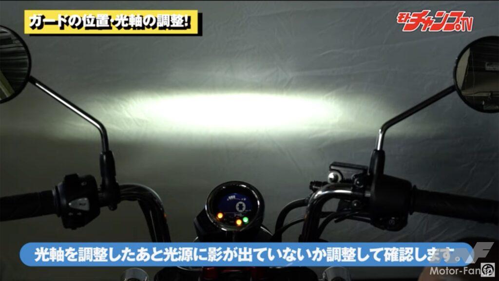 ヘッドライトへガードを装着したらエンジンを始動して光を壁などに当てる。光軸調整の方法はバイクに付属している取扱説明書に記されているので、それを参考にしてヘッドライト下の光軸調整ボルトで正しい高さに合わせる。また壁に当てた光を見てヘッドライトガード中央のバーが光を遮っていないか確認する。もし遮るようであればヘッドライトステー左右のボルトを緩めてガードを上下に動かし調整する。