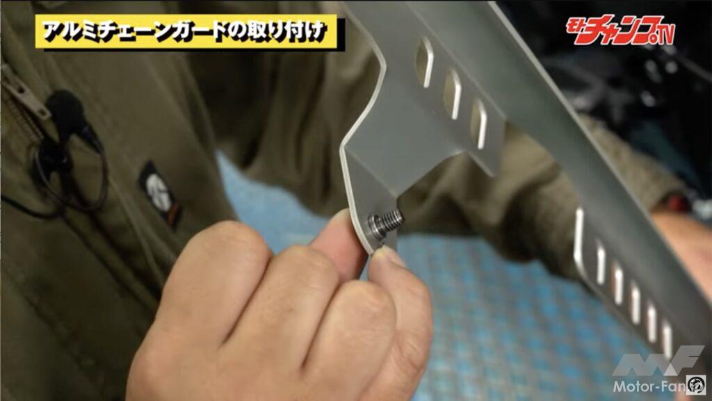 最後はアルミチェーンガードの装着方法だが、ここは至って簡単。純正チェーンガードを固定している前後2本のボルトを抜いてアルミチェーンガードと入れ替えるだけだからだ。ただし、注意点がある。このボルトは六角頭となっているので六角レンチを使いたいところだが、手前側ボルトの位置が悪くステップホルダーが邪魔して一般的な長さの六角レンチが使えないのだ。