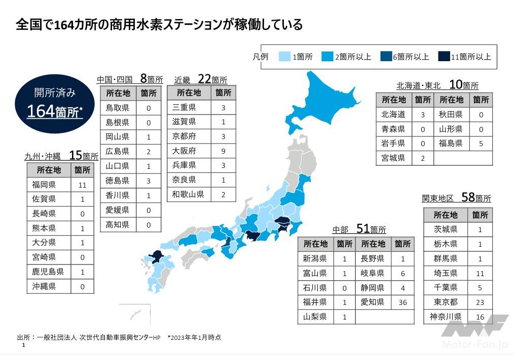 水素ステーションは全国で164個所あり(2023年1月現在)