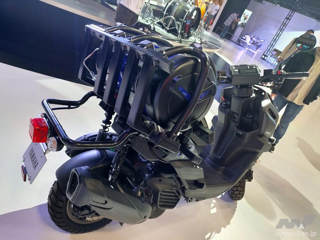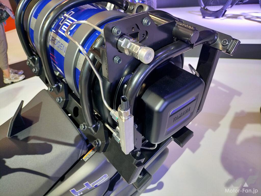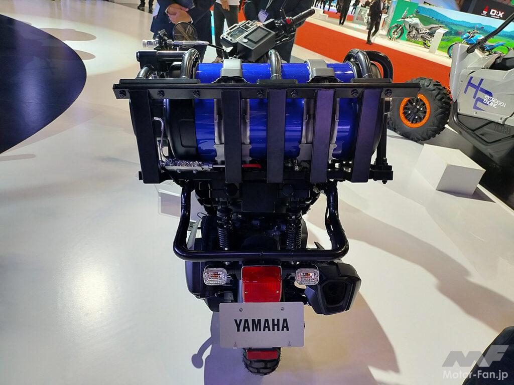 ヤマハは二輪への水素エンジン適用に当たり、ポピュラーかつ、HySEの研究スピードを加速させやすいという理由により、4ストローク単気筒124ccを採用。リア部分には大型の水素タンクが搭載されている。