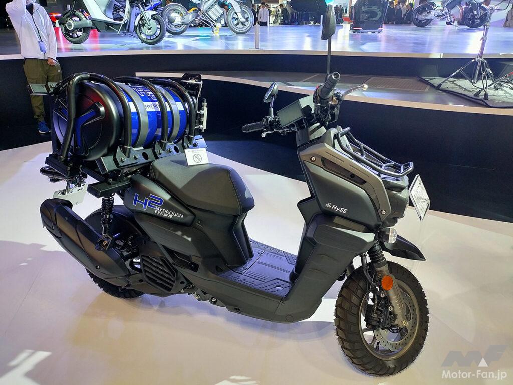 写真はヤマハブースに出展された、水素エンジン搭載の研究用スクーター。ヤマハが開発したこの車両は、2023年5月に設立された、水素小型モビリティエンジン研究組合「HySE(ハイス)」の研究活動用に製作されたもの。