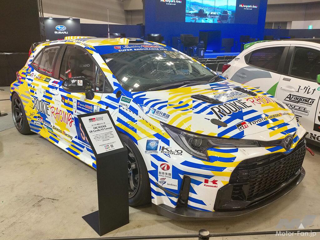 ジャパンモビリティショー2023に展示された、トヨタが開発したレース仕様の「ORC ROOKIE GR Corolla H2 Concept」。GRカローラのシャシー&ボディに水素エンジンを搭載。この車両は「2022年スーパー耐久シリーズ ST-Q クラス」に参戦。ガソリンエンジンと同じタイプの“排気音”が出るのも特徴。