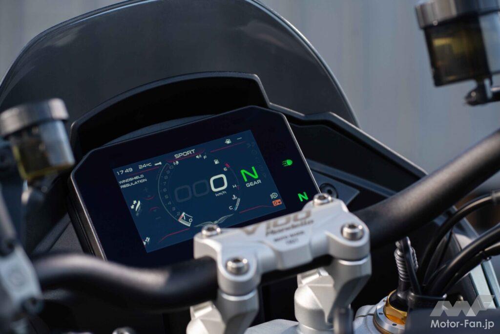 スポーツバージョンとなるV100マンデッロSもさらに進化して、オーリンズ・スマートEC2.0セミアクティブサスペンションの他、双方向クイックシフトギアボックス、ヒーター付きグリップ、TPMSタイヤ空気圧監視システム、Guzzi MIAマルチメディアプラットフォームなどに加え、新たにPPFライダーアシスタンスソリューションシステムも搭載されている。