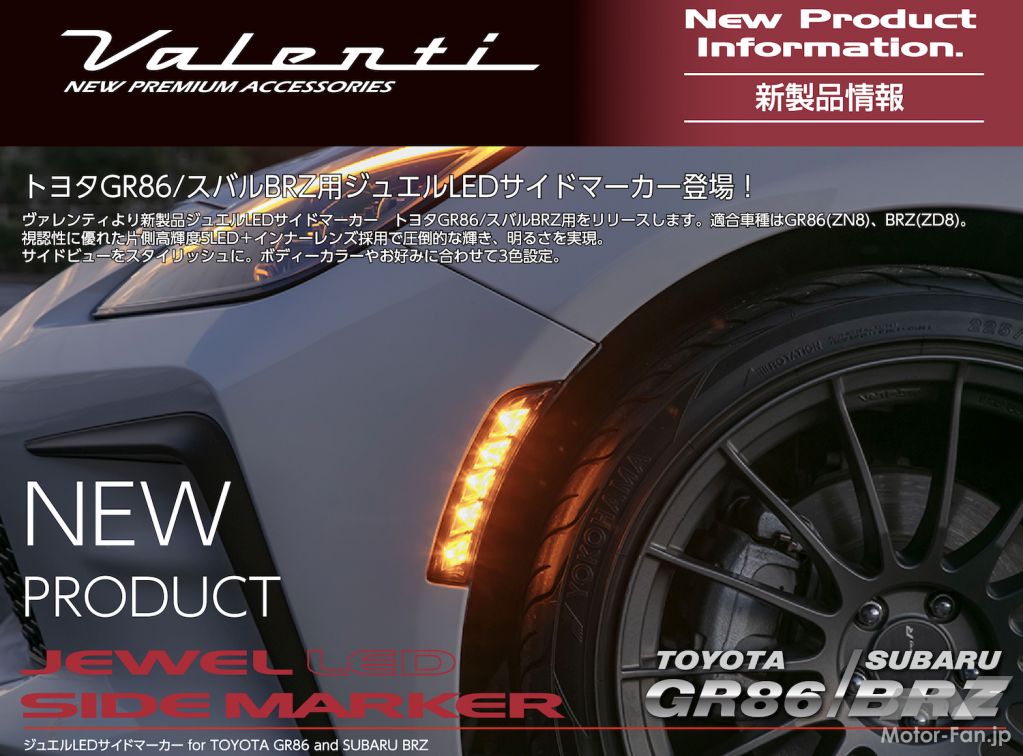 キラキラとした輝きと美しさ! ヴァレンティより、トヨタGR86/スバルBRZ用「ジュエルLEDサイドマーカー」が登場