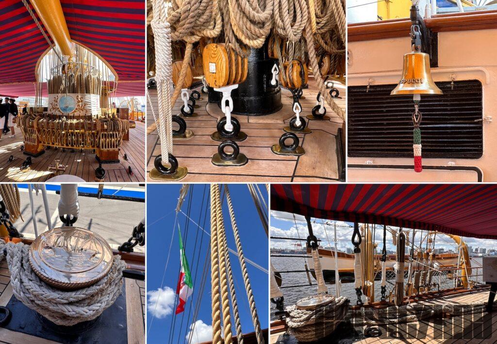 The ropes for the sails are grouped at the base of each mast. The position of each rope on each sail is fixed. The ship’s bell bears the letters VESPUCCI, and the bell-ringing cord is in the three colors of the Italian flag.