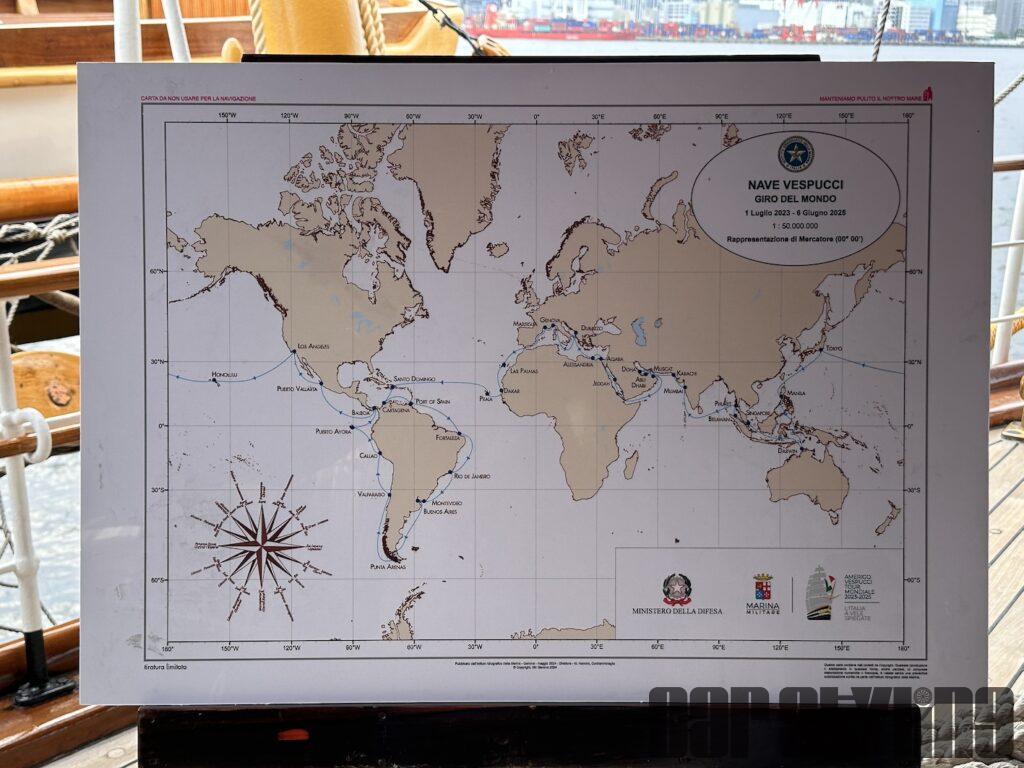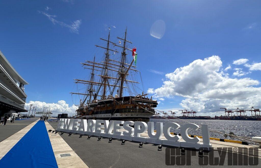 The Amerigo Vespucci departed Genoa, Italy, in July 2023, then headed west across the Atlantic Ocean, around the Americas, and across the Pacific Ocean, calling at Hawaii on the way, and now calling at Tokyo for the first time as its 17th port of call.