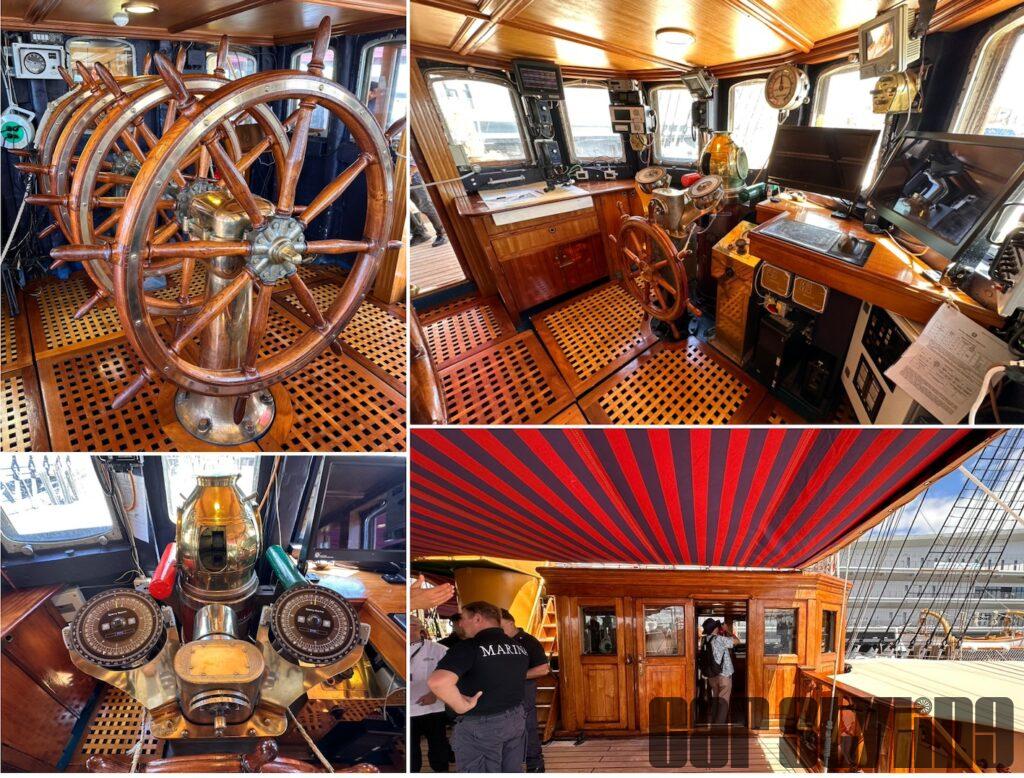 Rudder station at the stern. When cadets are on board for training, the rudder is operated by eight people, two on each of the four steering wheels, but normally it is operated by hydraulic assist on the bridge. The floor is a lattice screen.