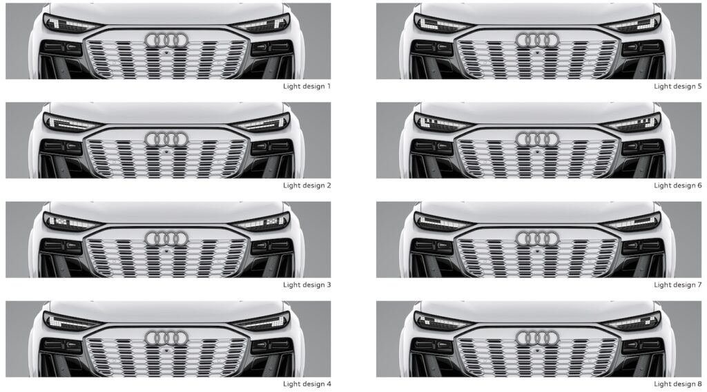 Q6 e-tronのフロント/リヤのライトは、「ユーザーが自分のお気に入りを選べる」デザインになっている。Audi Digital Lightは、それだけでなくクルマの幅を強調する役割もある。「デザインはヘッドラップから始まる」とプレゼンテーションで説明するように、さまざまな光り方でさまざまな機能を司る。