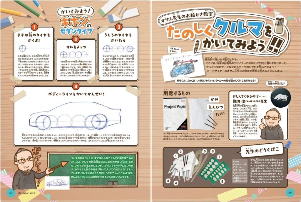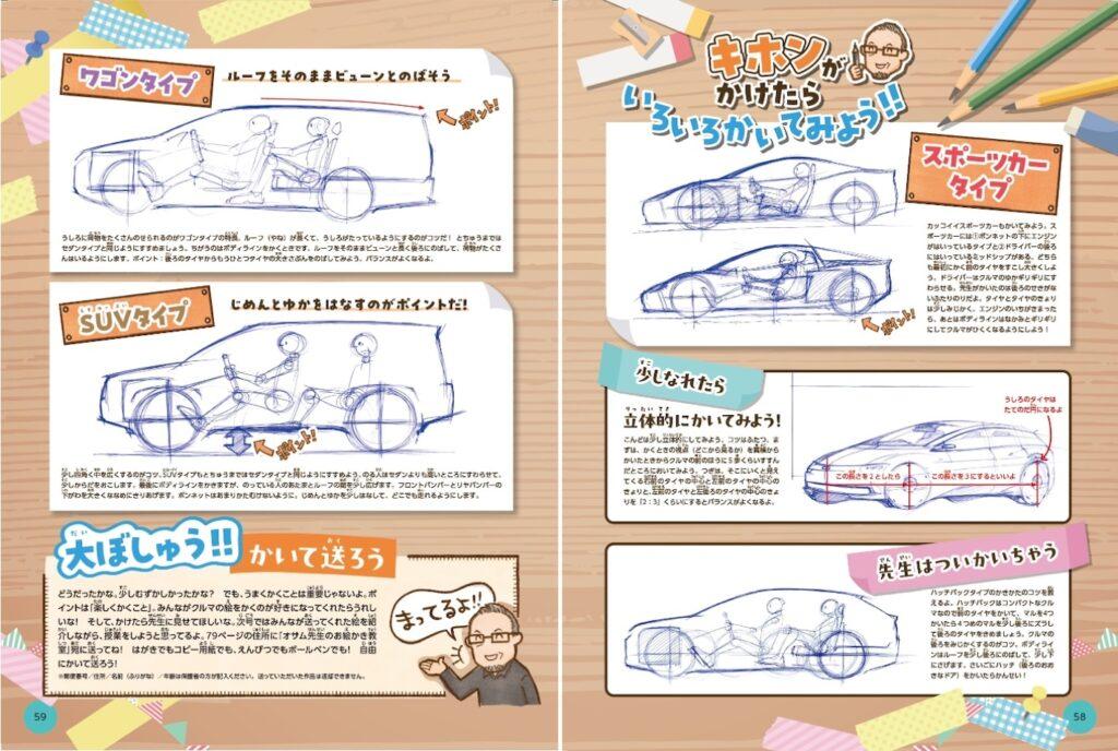 そして56ページから59ページの「楽しくクルマをかいてみよう!!」のコーナーはCarStyling編集長がクルマの描き方を紹介しています。カーデザイナーがどんなことを考えながら新しいクルマのスケッチを描いているのかの一端を垣間見ることができます。今、カーデザイナーを目指して学んでいる若者にとってもコツを掴む良い参考になりますし、クルマのバランスやプロポーションを取るセオリーも学びとることができます。
