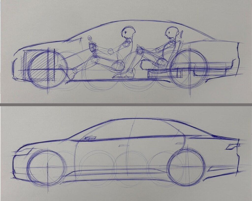 下段:ドアや窓、ヘッドランプやテールランプなどを描いていけばクルマに見えてくる。ここで個性を表現しましょう。