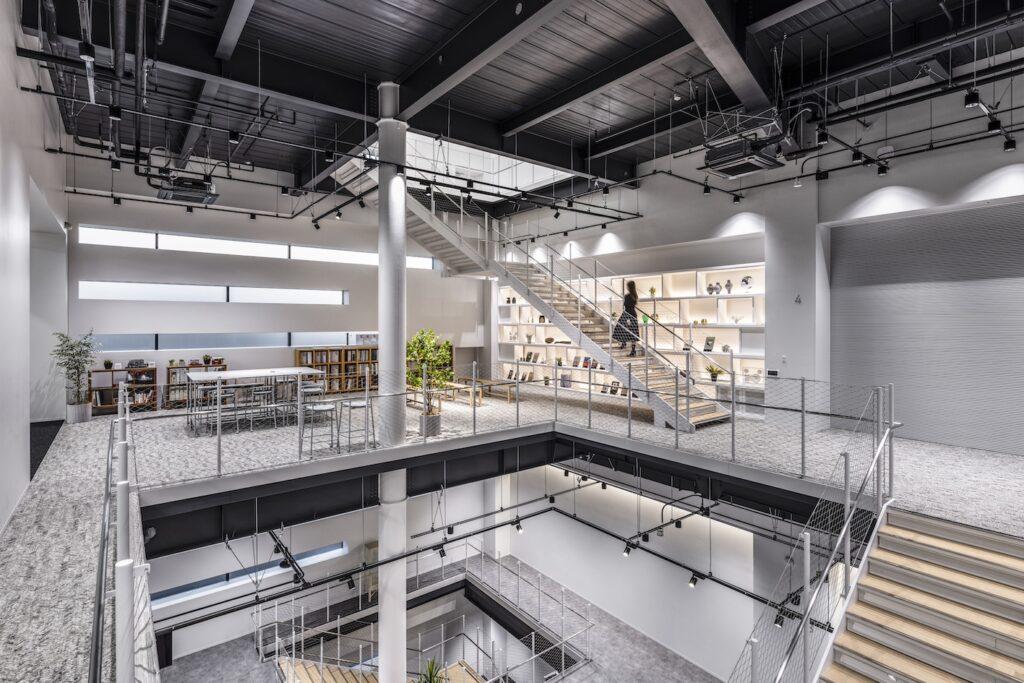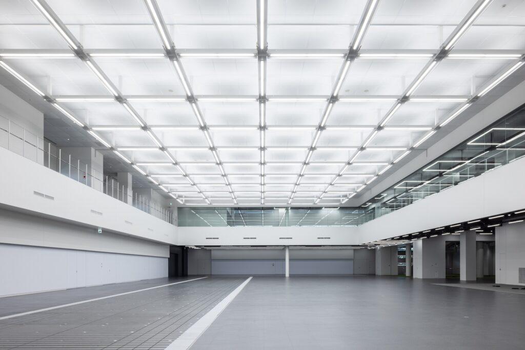 全面発光の天井の高いモデルルーム。2階からはガラス張りで1階のモデルルームが見渡せる。キャットウォークもあり、上方からの造形チェックが可能になっている。