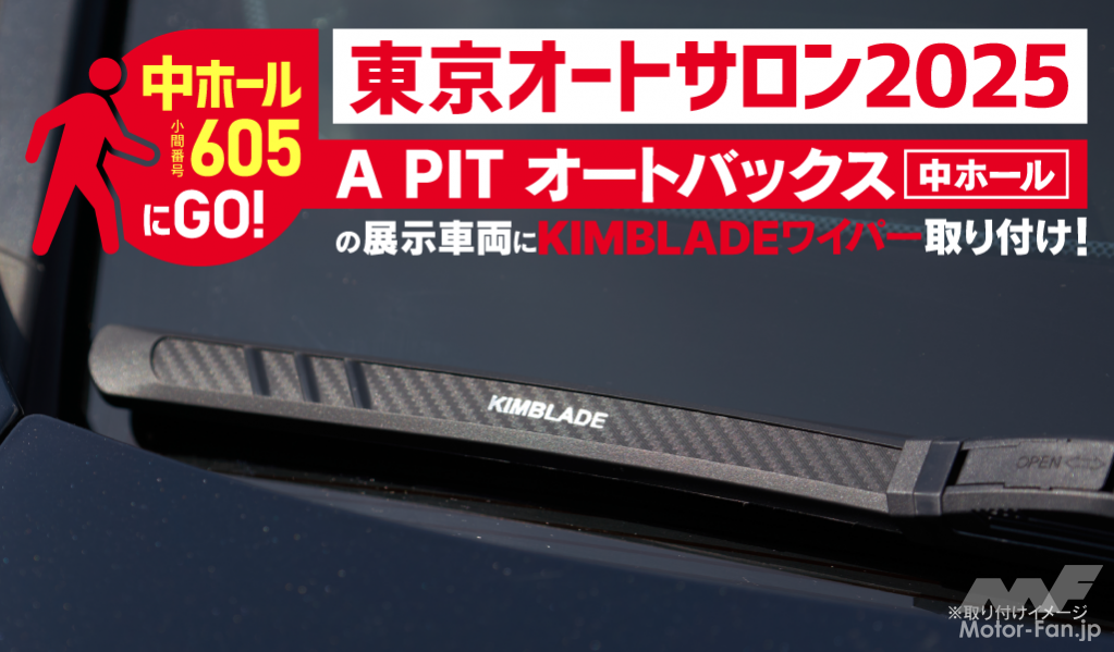 東京オートサロン2025のA PIT オートバックス(中ホール605)で、KIMBLADEワイパーを装着した展示車両が見られる