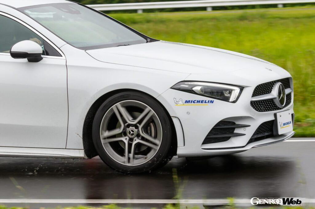 最も衝撃を受けたのがe・プライマシーだ。e・プライマシーといえば転がり抵抗性能「AAA」を達成した最高の低燃費性能を有するコンフォートタイヤだ。軽自動車からSUV、BEVまであらゆる車種に対応してるのが特徴である。そのe・プライマシーをBEVではなく、あえてICEのメルセデス・ベンツA180に装着して外周路とハンドリング路を走ることができた。