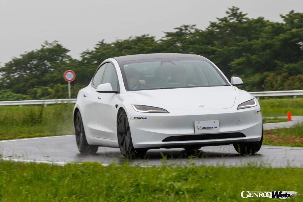 まずはパイロットスポーツ5を装着したテスラ・モデル3で外周路にコースイン。雨脚が強く、高速パイロンスラロームを試みるのにやや躊躇したが、そんな私の不安をよそにダブルレーンチェンジテストに近いスラロームをモデル3は難なくこなしていく。リヤタイヤはテスラの大トルクをしっかりと受け止め、次のパイロンに向かって高いグリップ力でクルマをぐいぐい加速させていく。ドライグリップの高さは既に認知していたので、パイロットスポーツ5のウエット性能の高さに本タイヤの真の実力を見た気がした。