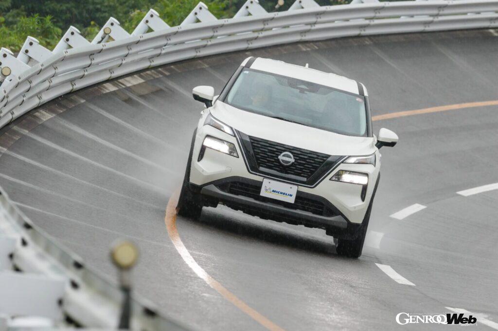 プライマシーSUV+は今回が初試乗だった。235/60R18を履いた日産エクストレイルeパワーでハンドリングコースを試す。やや腰高感のあるエクストレイルだが、操舵に対して実に素直にコーナーをトレースしていく。乗り心地もすこぶるよく、車重のあるSUVに対し、快適な乗り心地と高レベルなハンドリングを両立させたタイヤだと感じた。