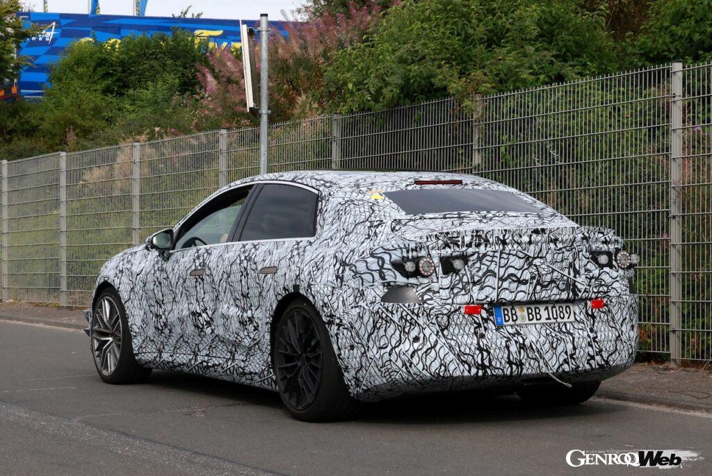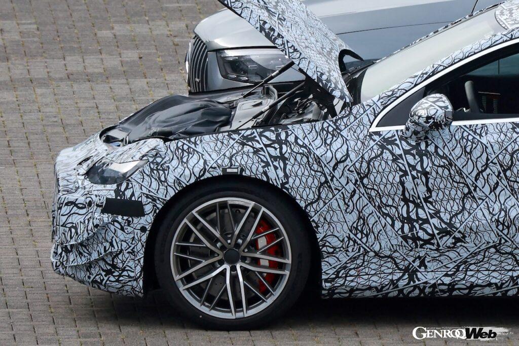 足もとを見ると、前後でサイズが異なるスポーティな大径ホイールを履いている。その奥には赤いキャリパーと強化ブレーキも確認できる。当然、リヤにクワッドエキゾーストパイプはないが、AMG以外のプロトタイプには見られないリップスポイラーが装着されているのがわかる。