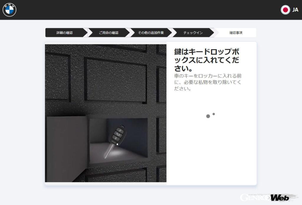 これは、スマートフォンのSMSまたはeメールに届いたオンライン・チェックイン用のリンクにアクセスして、予約内容を確認、洗車の有無などのリクエストをすれば完了というシンプルなもので、あとはクルマを持ち込み、ディーラーに設置されている小型のロッカーを備えたキオスク端末のタッチパネルを指示に従って携帯電話番号の入力や、サインを行い、開いたロッカーの中にキーを預ければ、誰にも会わずに入庫の手続きを完了することができる。