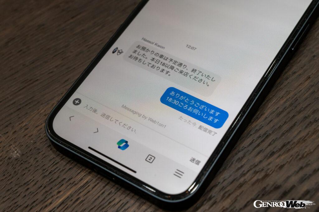 その内容に安心するとともに、普段自分では見ることができない、車体の裏側が見られたこと。サスペンションなどに要所要所では、寄った画面を通じて、状態がいいことを自分の目で確認できたのは何よりの収穫だった。それとともに、アプリの『チャットファンクション』を通じて、今回の作業終了の案内が届き、いつでも引き取り可能な旨が記されていた。