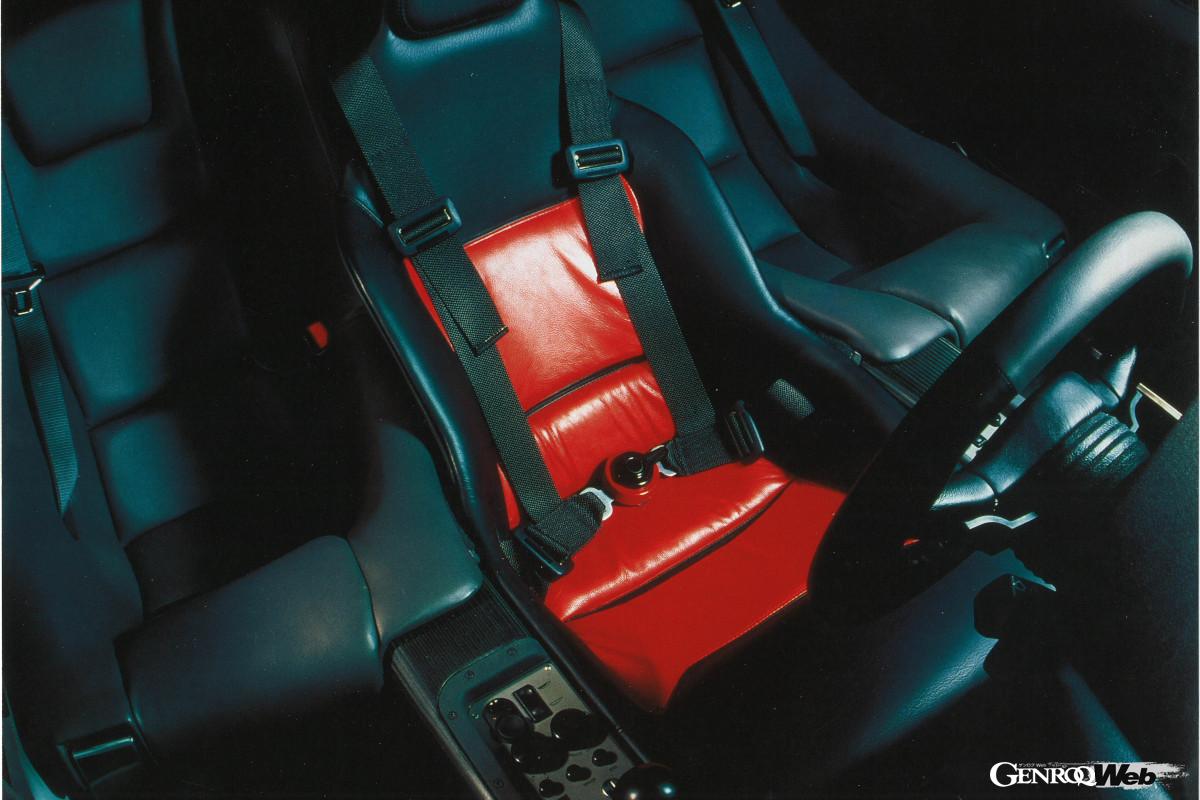 マクラーレンF1は、オンロードへと導かれたF1マシンであるとよく形容されるが、それは必ずしも正しい表現ではない。なぜならロードカーたるF1は、車両規定による制約がない分、逆に当時のF1マシンよりもはるかに進化した存在だったからだ。その象徴ともいえるのが、エアロダイナミクスへの取り組みだ。エクステリアの画像を見ていただければすぐに理解できるように、マクラーレンF1のボディ上面には派手な造形の空力的付加物は採用されていない。正確にはリヤエンドには収納時を含めれば3ポジションに角度が変化できるリヤウイングが装備されており、ドライバーはそのポジションを自ら変化させることでダウンフォース量を調整できるほか、ブレーキング時にはエアブレーキとしての機能も果たす。