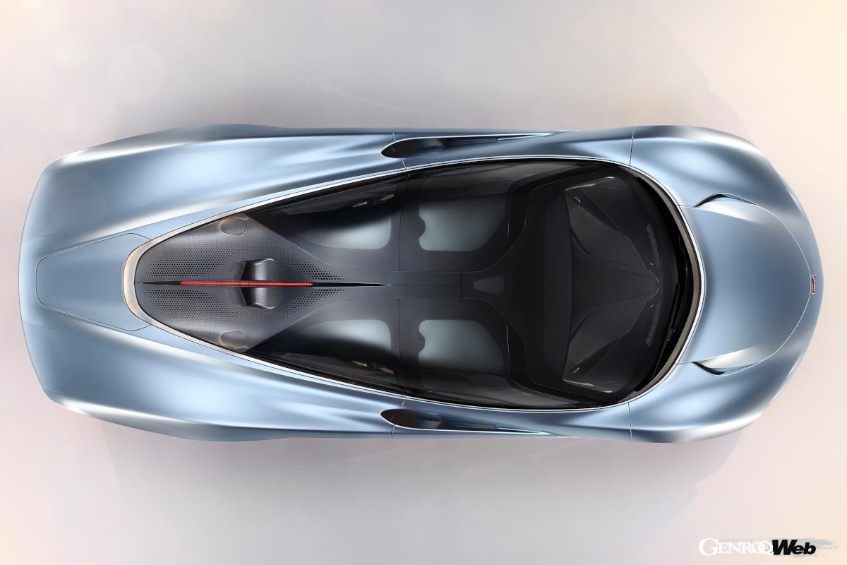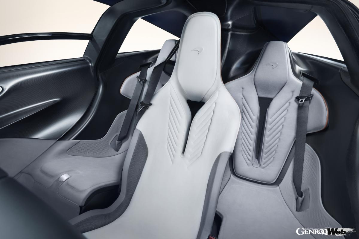 すべての曲線は走行中に負担となるドラッグを低減し、フロントから特徴的なロングテールに至るまで、シームレスにエアを誘導。ただ美しいだけではなく、そのすべてに機能があるというマクラーレンのデザイン哲学は、このスピードテールにおいて、ひとつの頂点を極めたといった印象が強い。